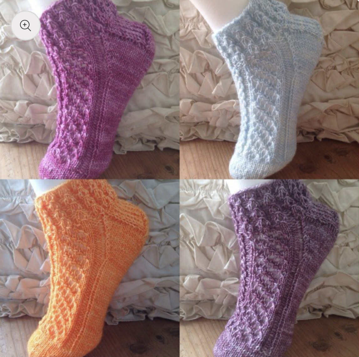 Du har da nok garn til 5 par av disse i fem forskjellige farger. ( opp til ca str 38/ 39. Vil du ha større str, kan man ta en annen farge på vrangbord eller tå :-)