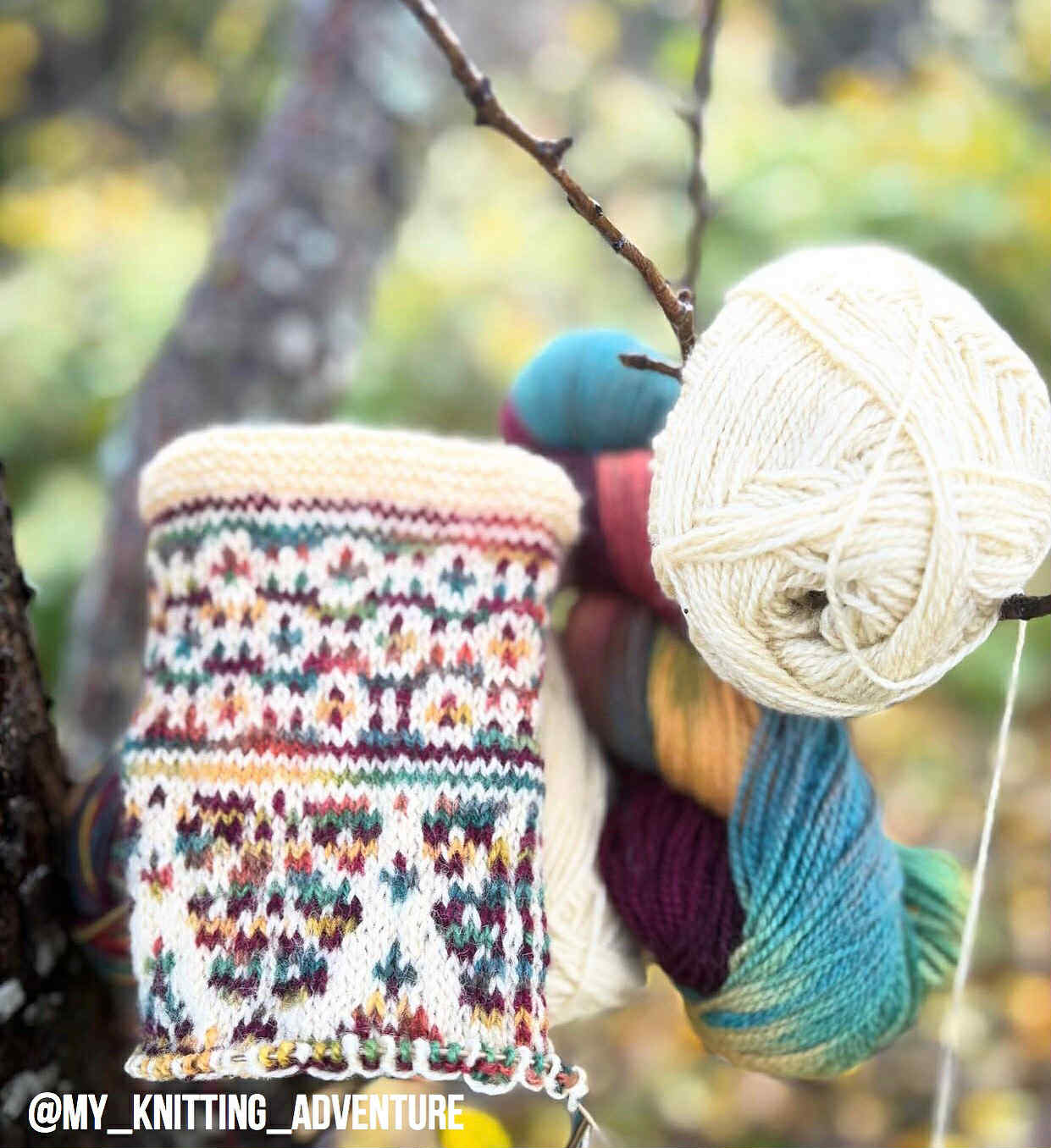 En fantastisk effekt når man bruker håndfarget garn som mønsterfarge på gensere og kofter. Og som mønsterfarge i votter, luer og annen småstrikk.