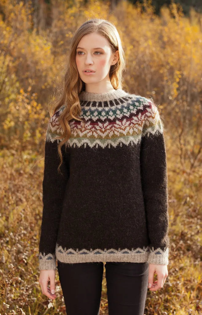 Afmæli - Strikkeoppskrift. Islandskofte med mønsterstrikk. Garn: LettLopi.
