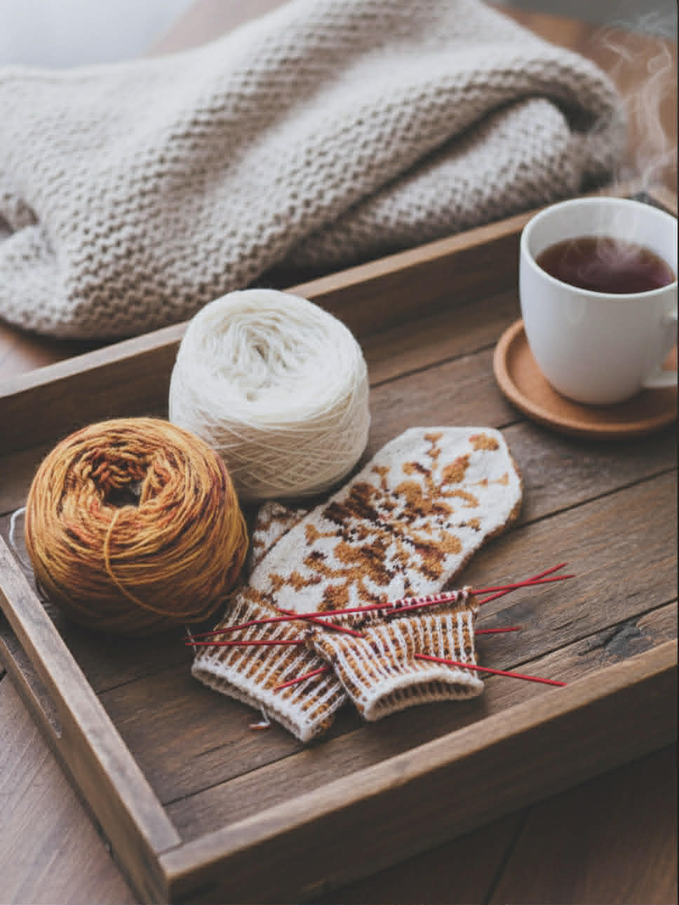 Vottene kan strikkes i Kvitlammets håndfarget Finull fra Rauma + Fjære fra Hillesvåg. Fargene på bildet: Høstløv + naturhvit.