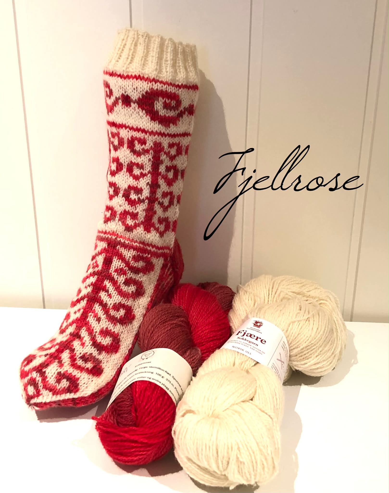 Fjellrose er strikket i Kvitlammets håndfargede Fjære fra Hillesvåg., men annet tilsvarende garn kan også brukes.