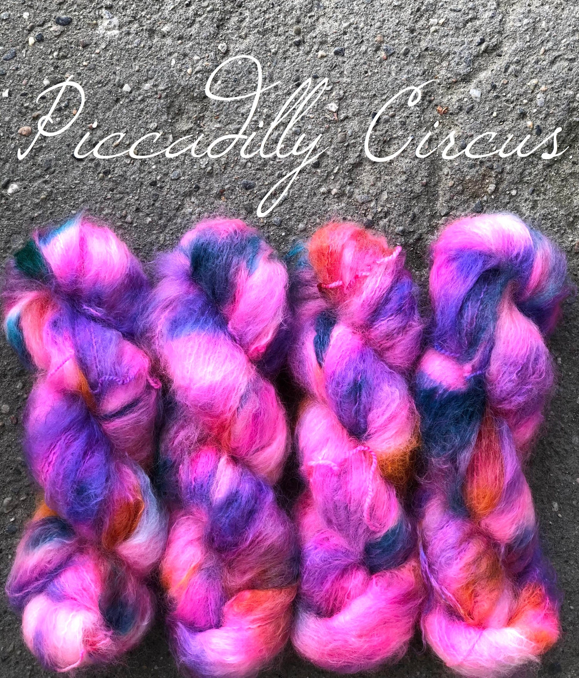Piccadilly Circus. Fat Mohair, ubehandlet. 100 g: Ca 200 m. Ved kjøp av minimum 3 hesper, får du med oppskriften til Karna-genseren.