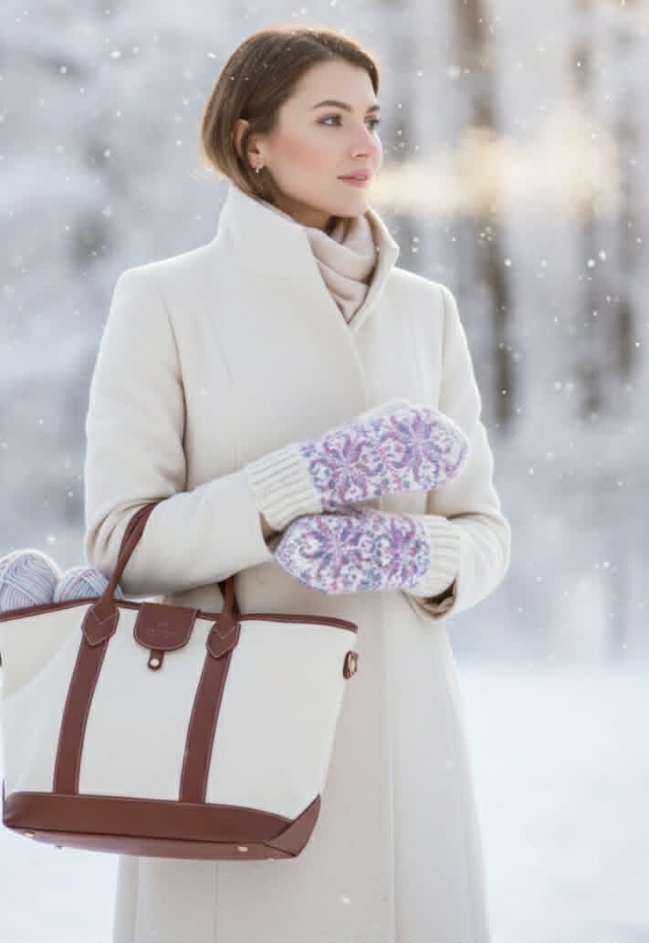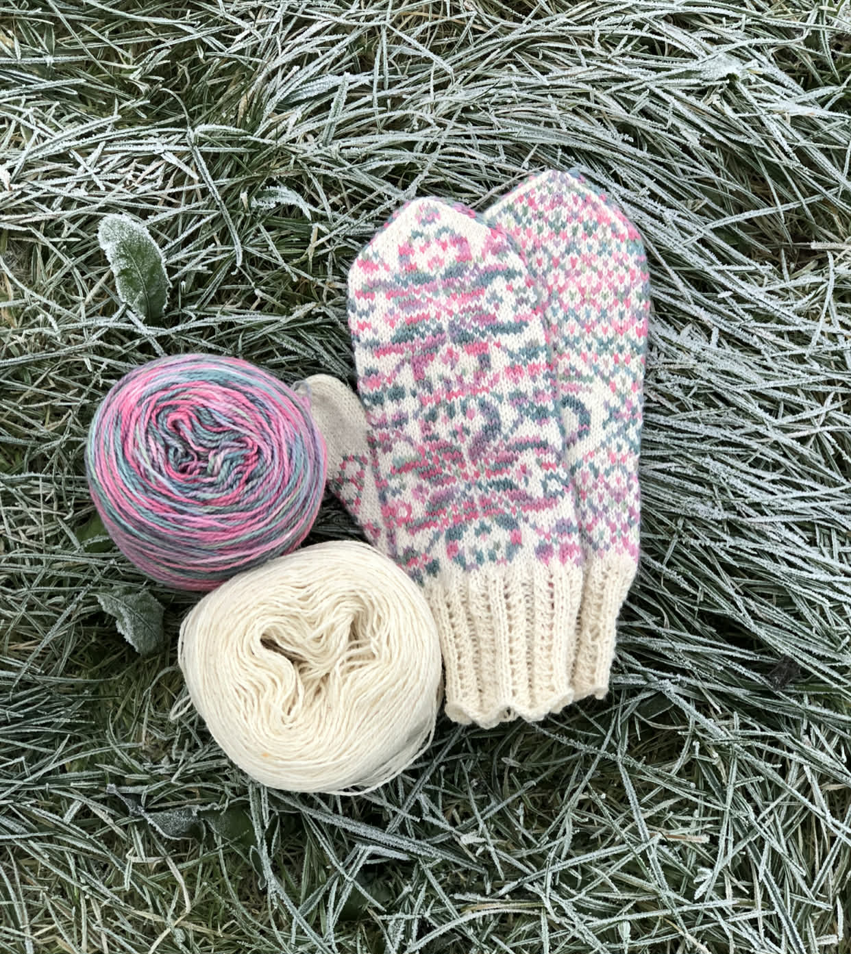 Vottene kan strikkes i Kvitlammets håndfarget Finull fra Rauma + Fjære fra Hillesvåg. Fargene på bildet: Faded Flowers + naturhvit.