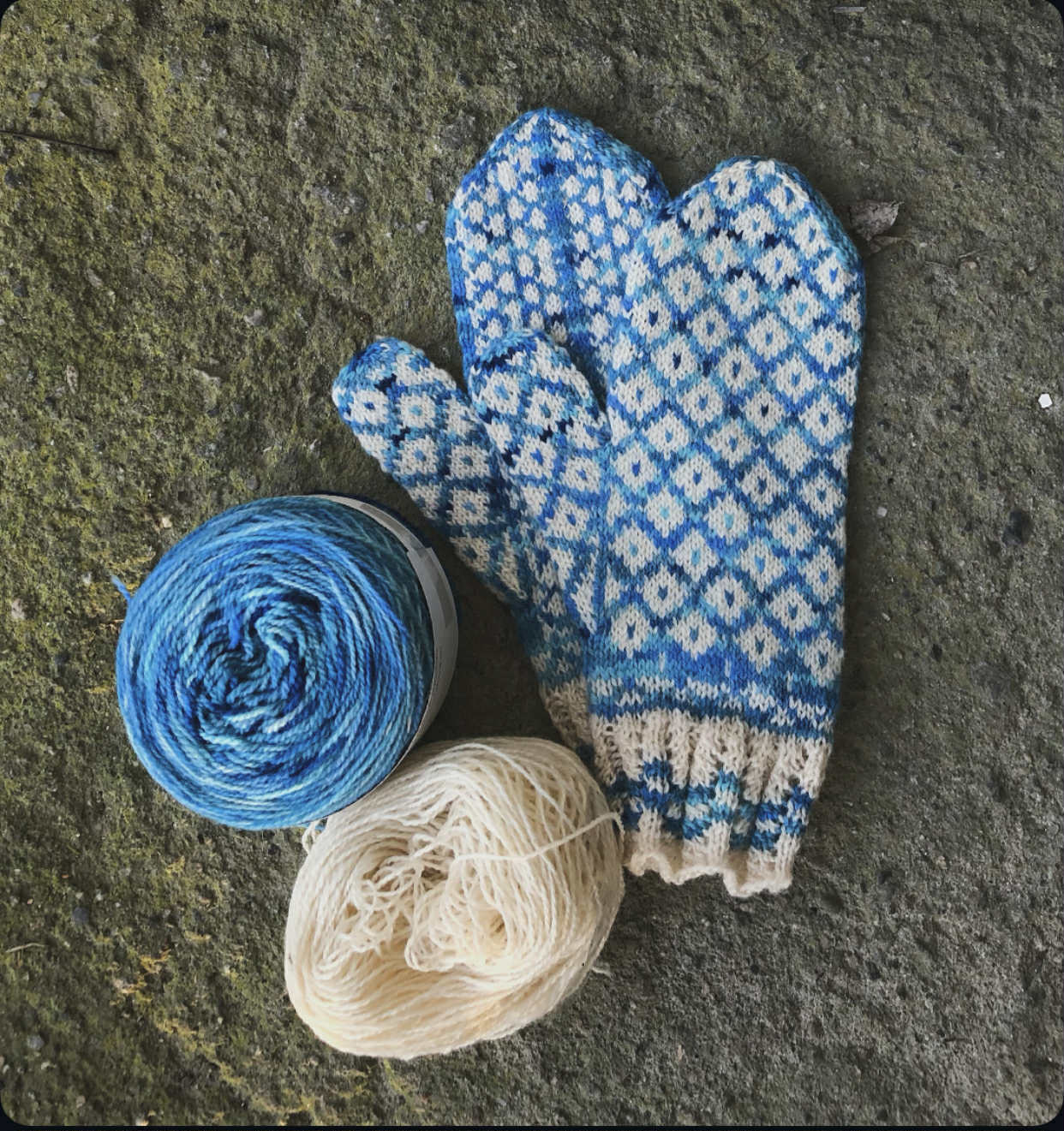 Garn: Håndfarget Finull fra Rauma. Farge på bilde: Blue Bay \ naturhvit.