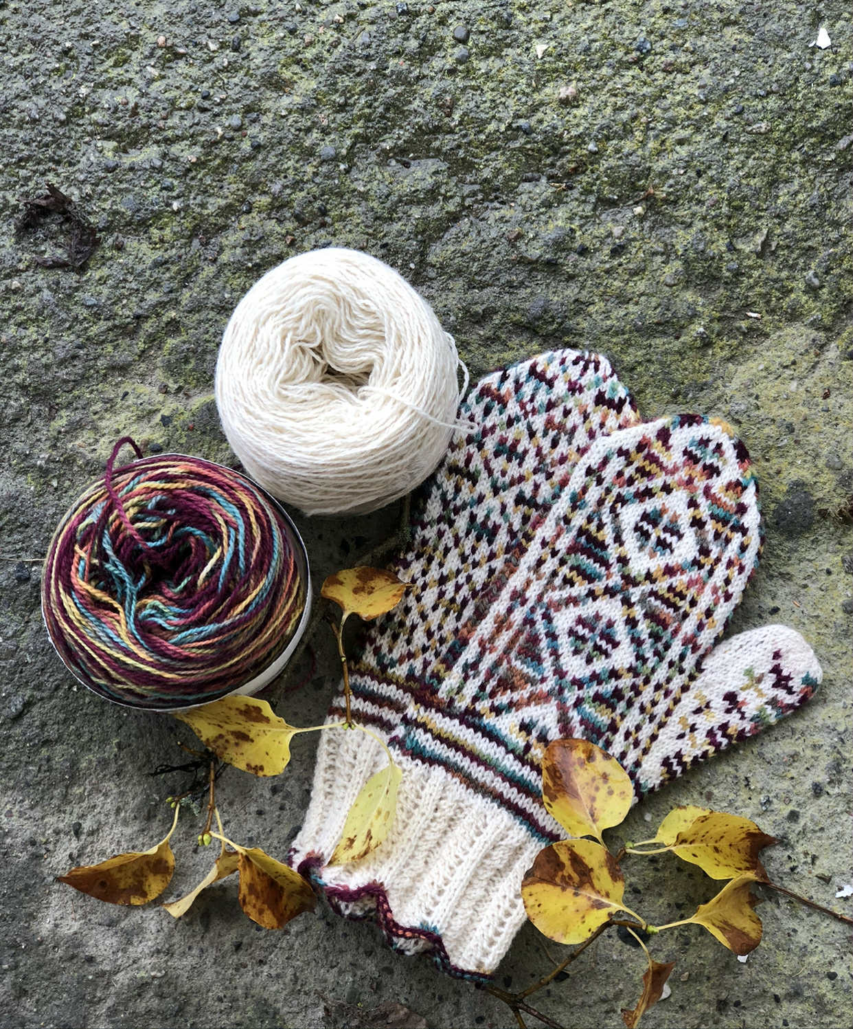 Som mønsterfarge brukte jeg Kvitlammets håndfarget Finull fra Rauma som mønsterfarge. Farge: Woodstock + naturhvit bunnfarge.