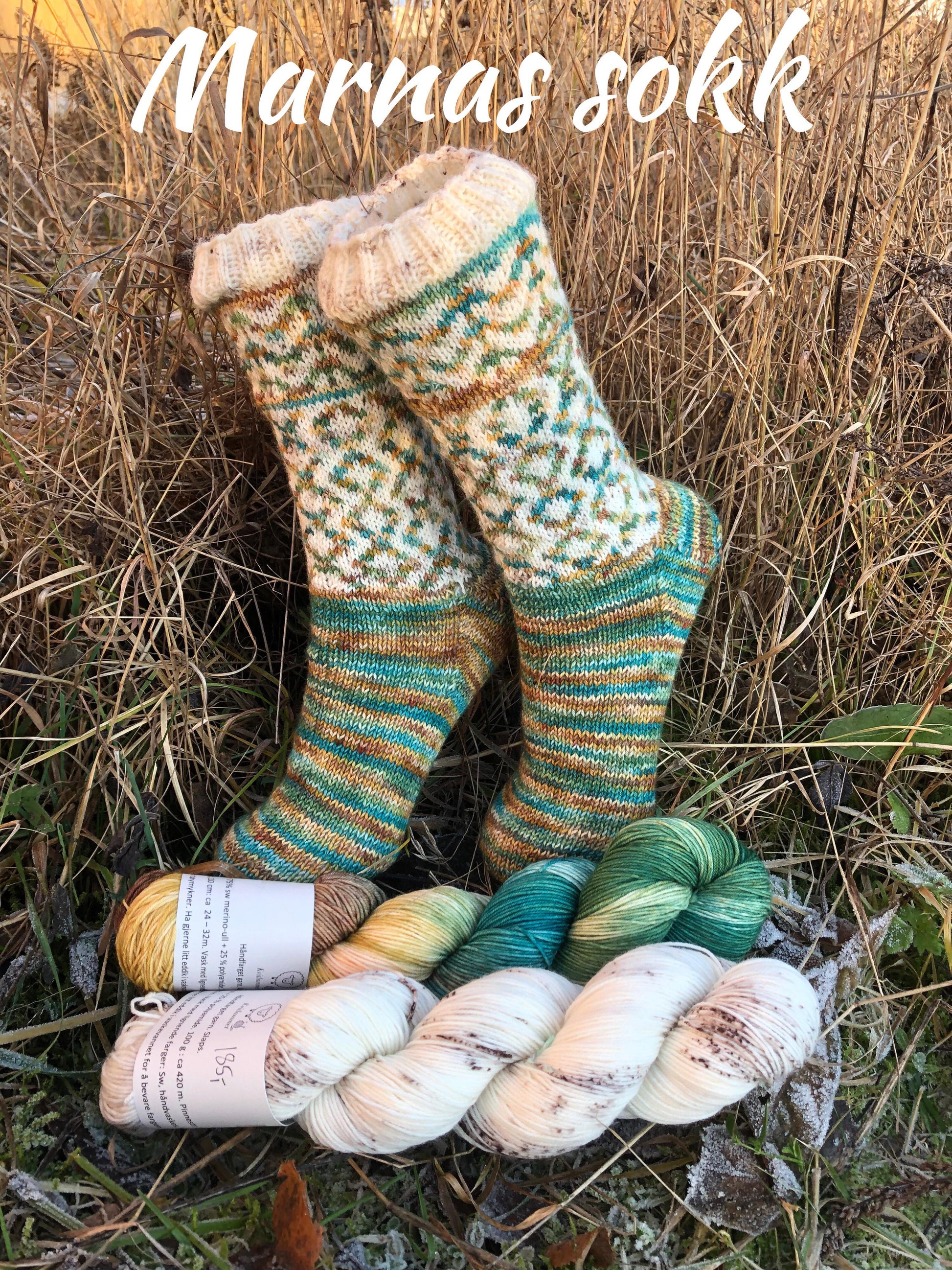 Marnas sokk er strikket med Kvitlammets håndfargede forsterkede garn. Annet tilsvarende garn, feks Fabel fra Drops.