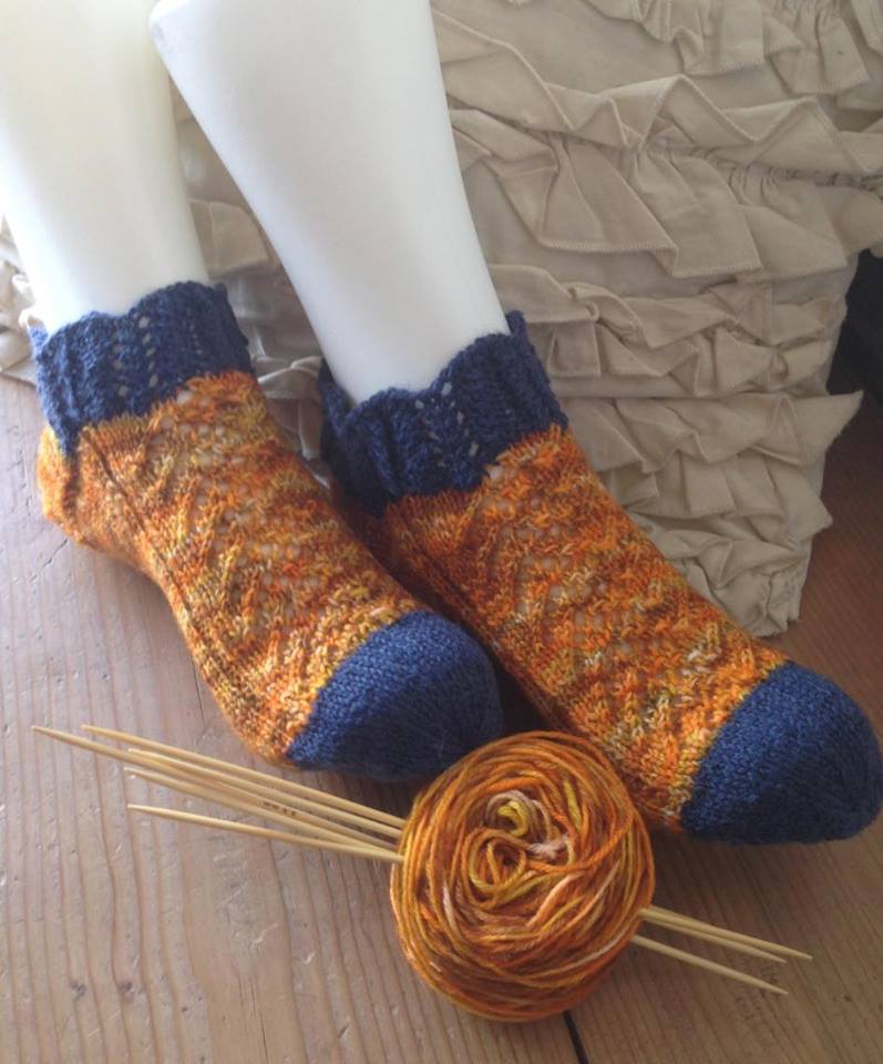 Strikket i tynt forsterket ullgarn, f.eks Fabel, eller håndfarget sokkegarn fra denne butikken.