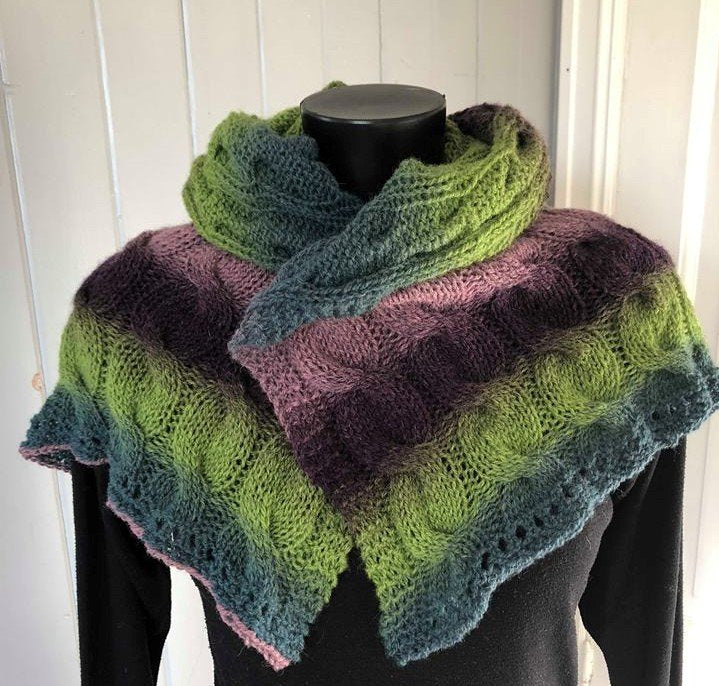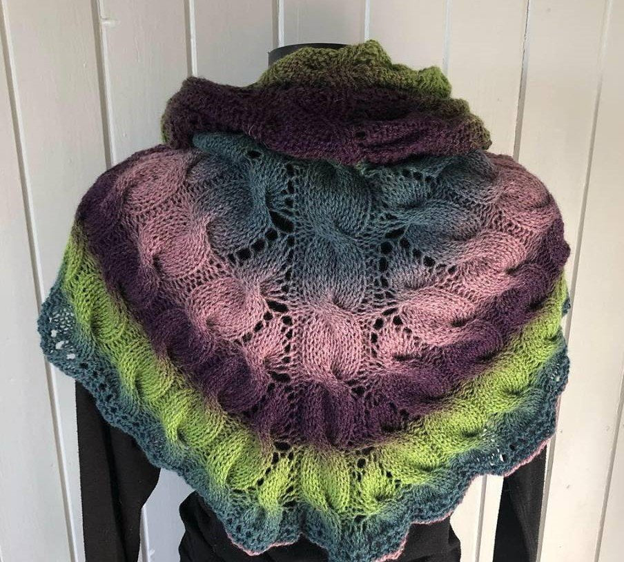 Sjalet strikket i Kauni garn: Dette sjalet er en mindre versjon, og er mer et skuldersjel/skjerf. Du avslutter sjalet når du er ferdig med 1 nøste Kauni effektgarn.