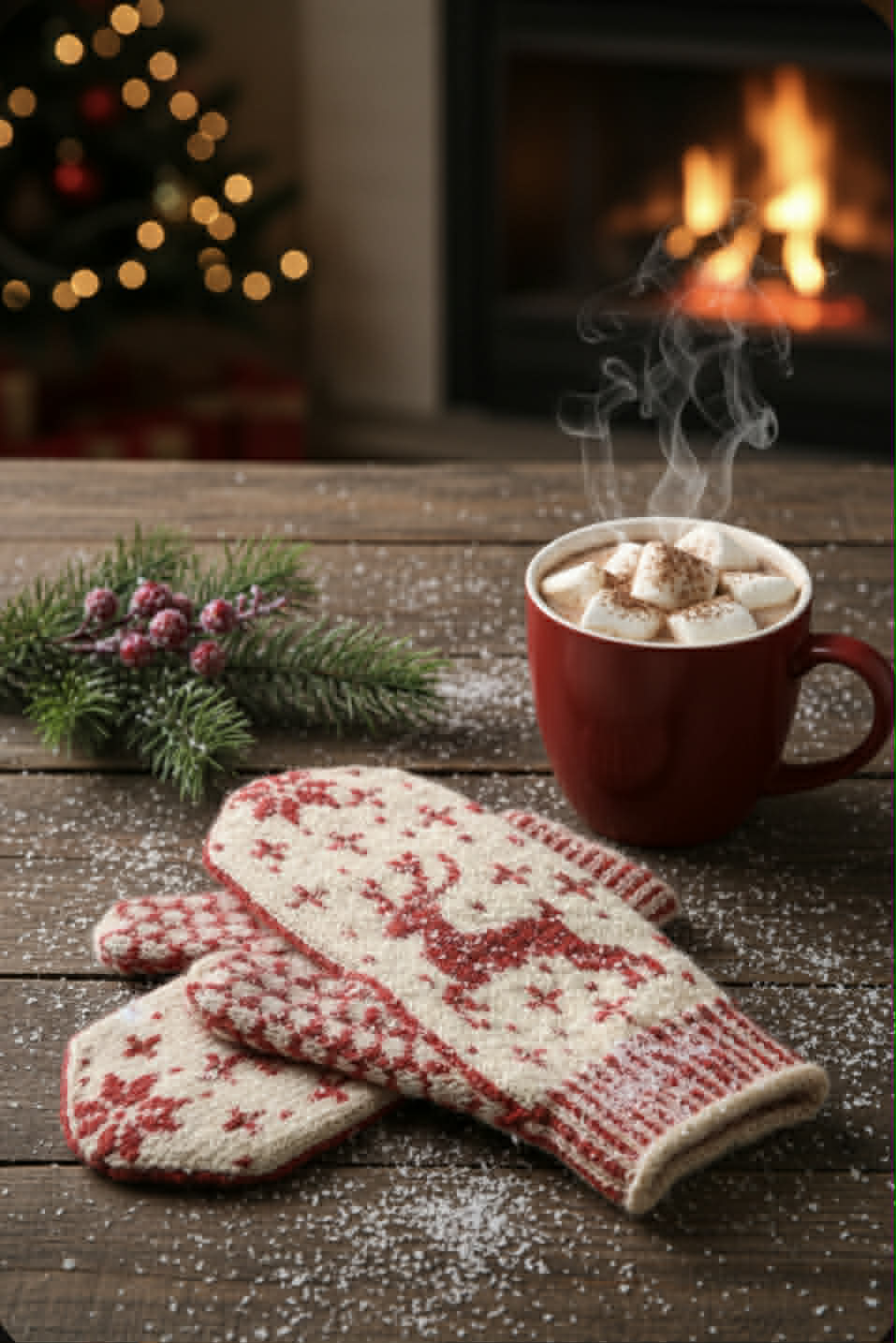 Vottene kan strikkes i Kvitlammets håndfarget Finull fra Rauma + Fjære fra Hillesvåg. Fargene på bildet: Vermillon Rød + naturhvit.
